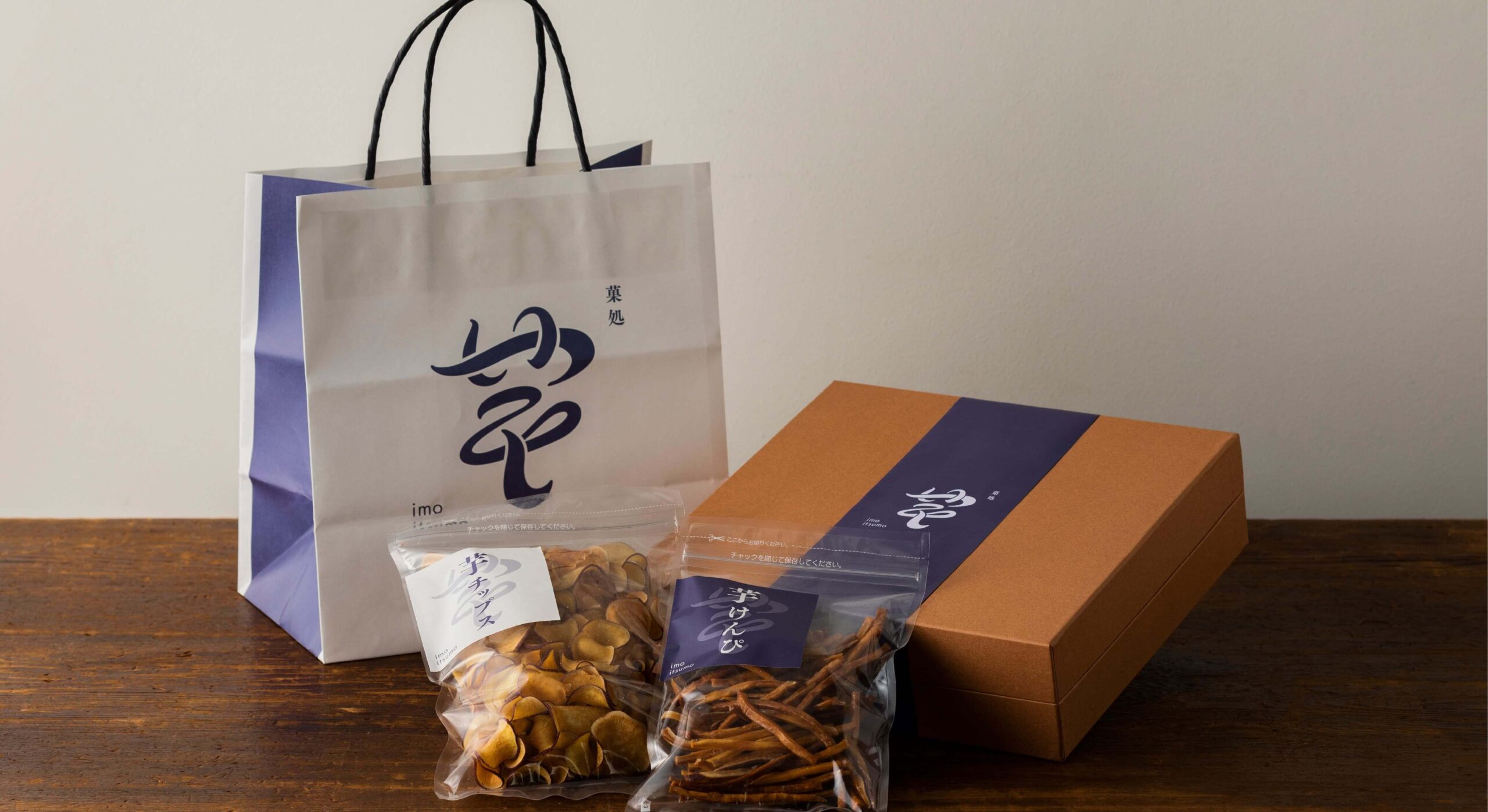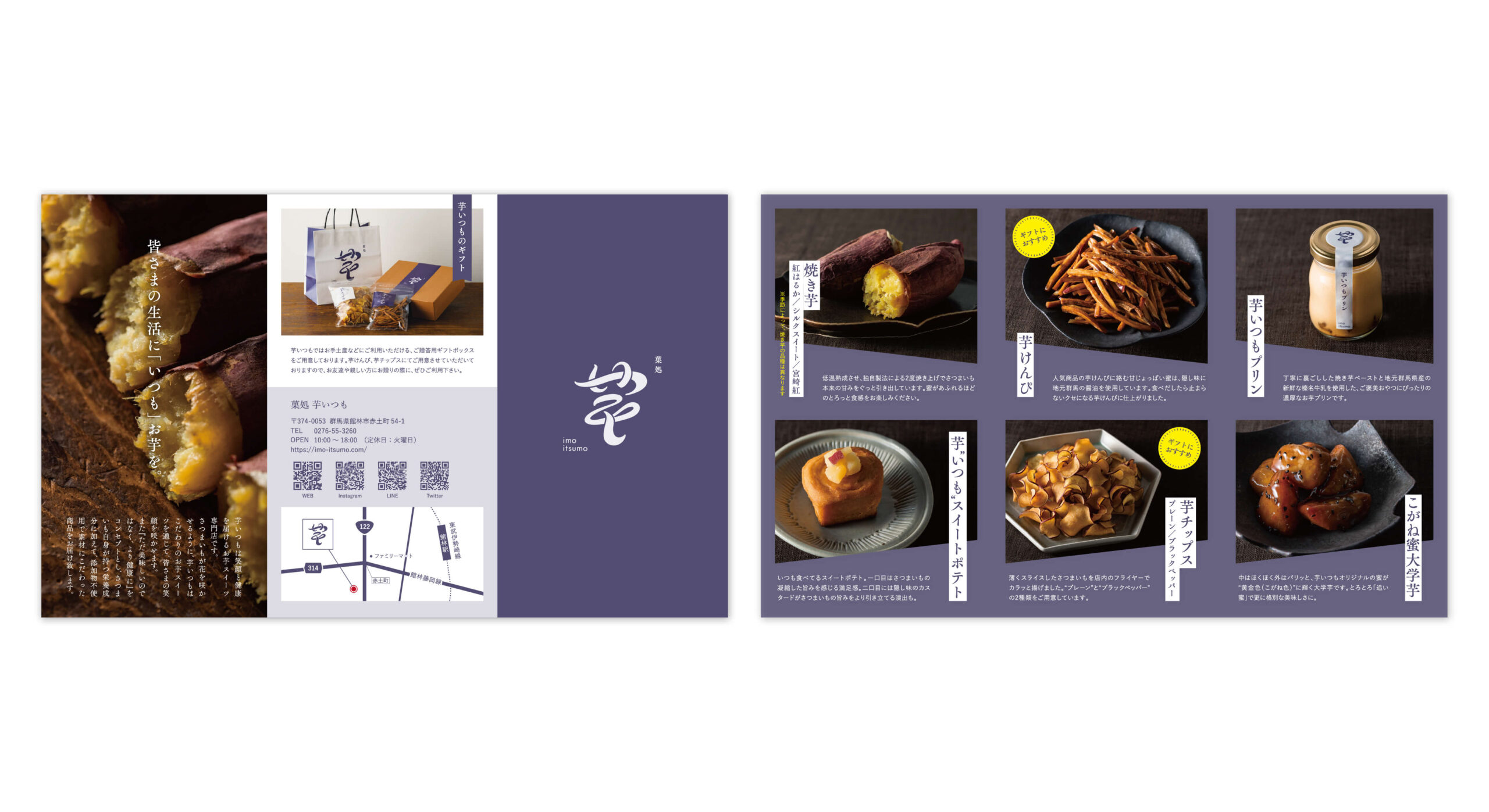 群馬県にある、”皆さまの生活に「いつも」お芋を”をコンセプトにしたお芋スイーツ専門店。流れるような「芋」の字に「いつも」が隠れた印象的なロゴマークを軸に、伝統的な和のイメージで統一。