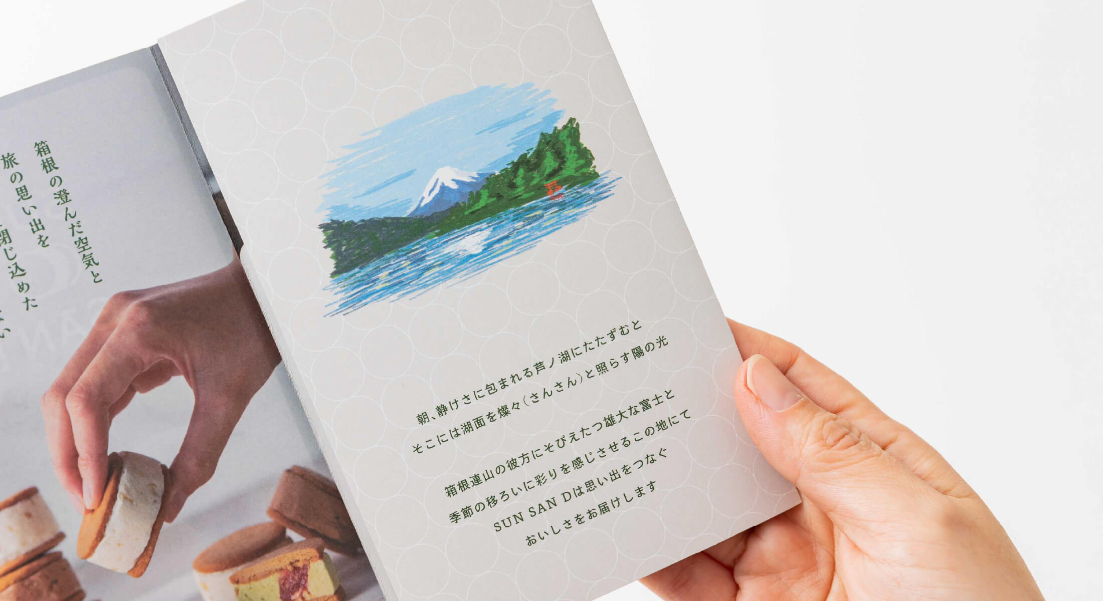 Located on the shores of Lake Ashinoko in Hakone, SUN SAN D is crafted to become Hakone’s next iconic souvenir. Our design aims to encapsulate the scenery and memories of a journey through Hakone, preserving the essence of the experience in each package.